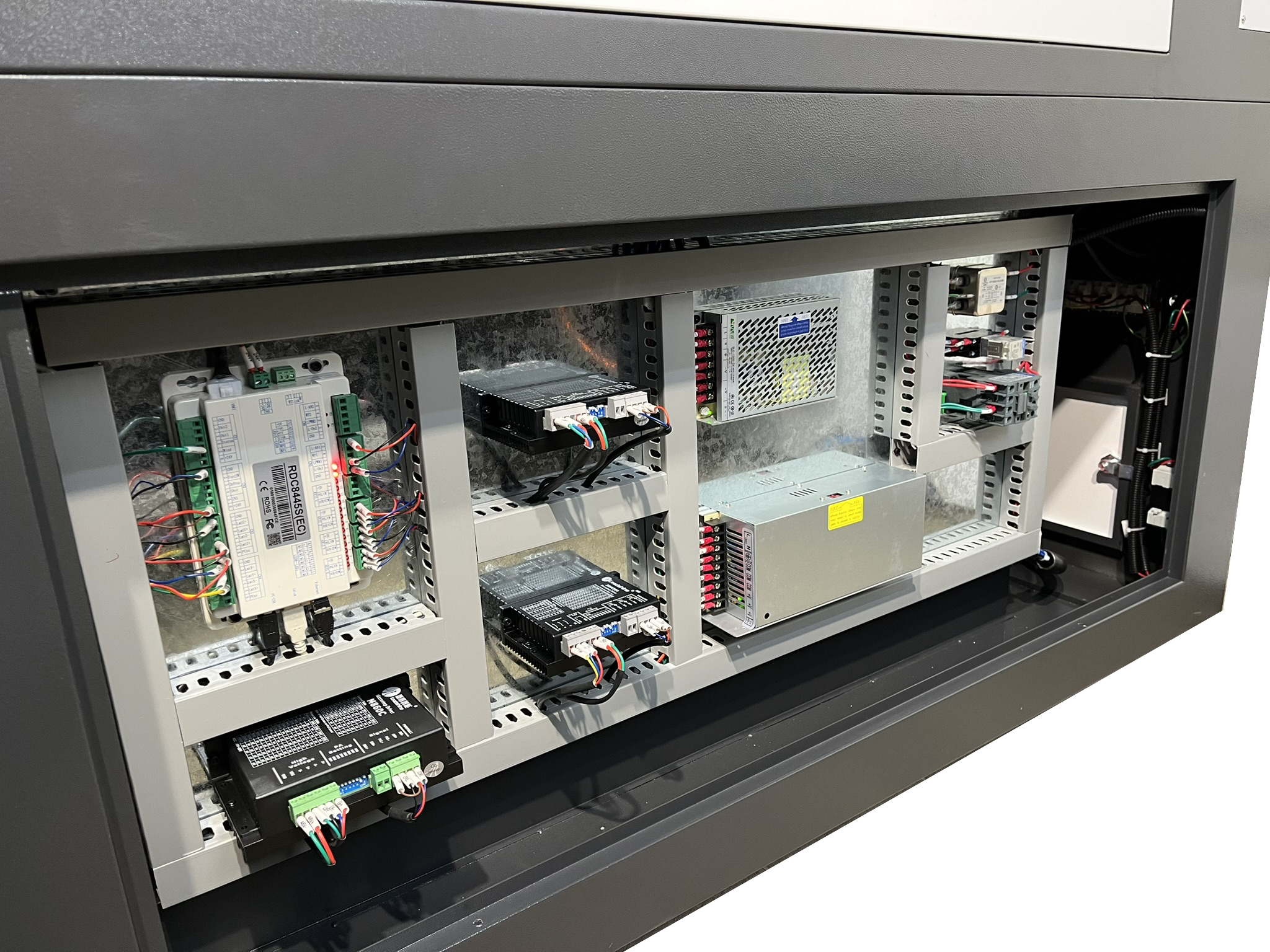 Urządzenie zostało wyposażone w elektrycznie regulowany stół z pojemnikiem na odpady, co zwiększa komfort i efektywność pracy, szczególnie przy produkcji seryjnej. Precyzyjne prowadnice marki HIWIN oraz sterownik Ruida zapewniają płynne i dokładne ruchy głowicy laserowej, co przekłada się na bardzo wysoką jakość wykonywanych elementów.
